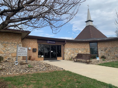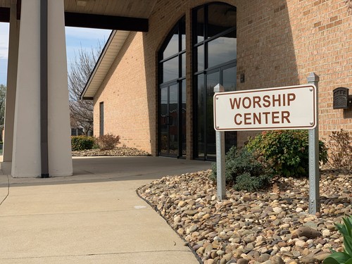 Main entrance to the Worship Center is to the far left of the front of the church.