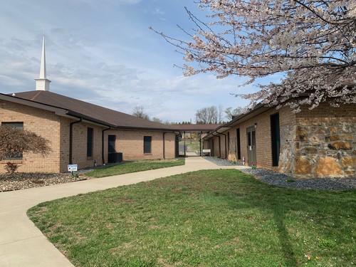 The center sidewalk between the buildings leads to the Fellowship Hall on the right.